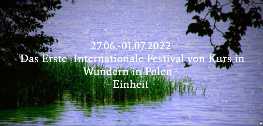 Das Erste Internationale Festival von Ein Kurs in Wundern findet vom 27.06. – 01.07.2022 in Polen (außerhalb von Gdańsk) statt. Dieses Event wird von Lehrern aus Deutschland, den USA, Großbritannien, den Niederlanden und Polen durchgeführt und ins Deutsche, Englische und Polnische übersetzt.