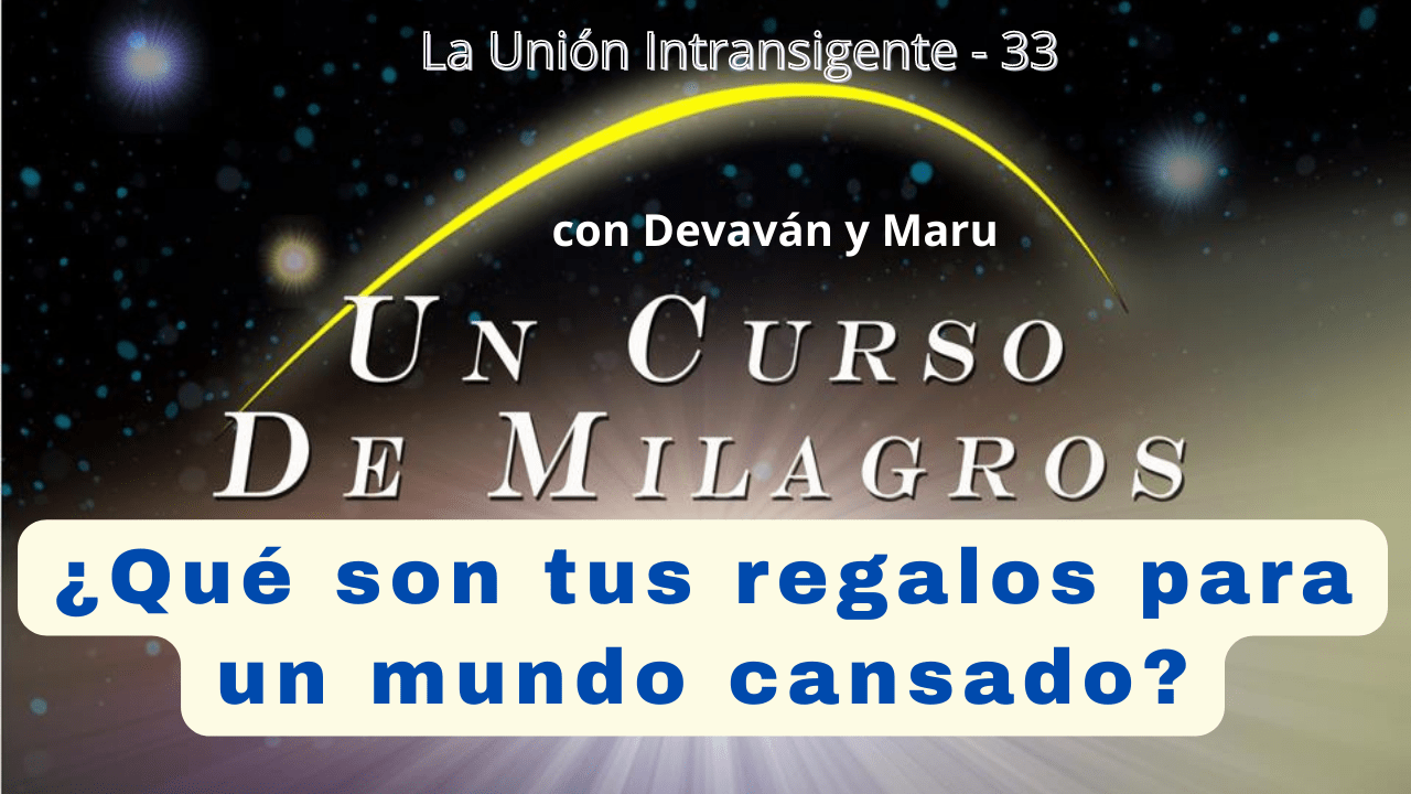 Devaván y Maru (de AR) miran a ideas acerca de los REGALOS los que todavía queremos dar a un MUNDO CANSADO: como entendemos nuestra interacción con el y en que punto entra la necesitad de recordarse que el mundo no existe y todo como se presenta en la percepción es nada más que un juego con ilusiones. Compartimos nuestra realización en conexión con el Espíritu Santo, con Jesús, que nos ofrece superar juntos a todos los obstaculos y bendecir a un mundo agotado. Experimentamos esta transformación en una Experiencia de Luz y Amor, un momento de total Silencio mental que es nuestra naturaleza. ◊