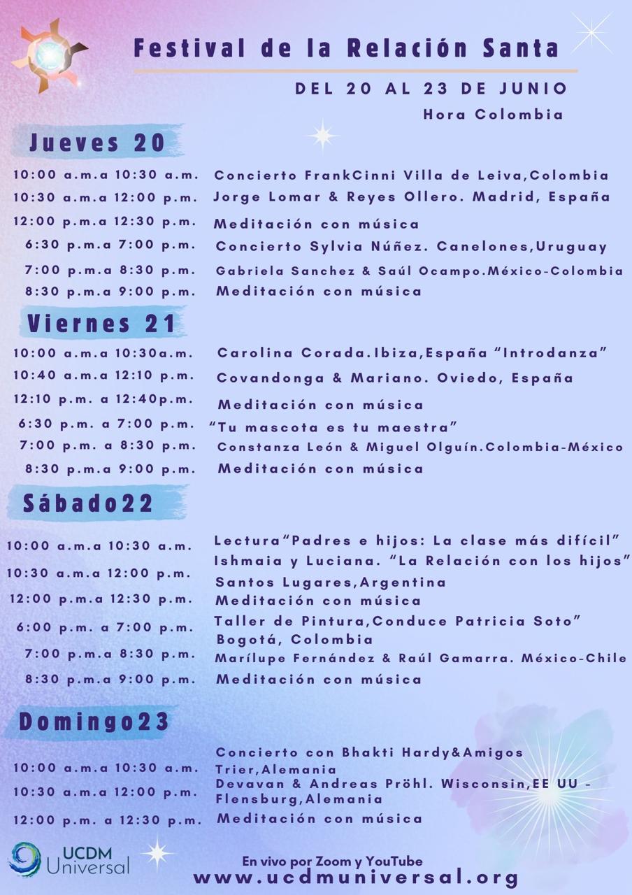— Sessions during the day: with invited teachers from all over the world. On Sunday, June 23, 2024 at 10:30 A.M. the session “Relationship with God” of Devavan and Andreas in English has been interpreted simultaneously into Spanish, with an half hour music presentation of Bhakti Hardy and Friends at 10 A.M. ◊ — Practical Testimonies and Musical entertainment as well as Dance. “All times are Hour Colombia” For more information visit us: https://ucdmuniversal.org/ ◊ ◊ Through a “CLICK” 👉 at https://bit.ly/3pv0iyW (ZOOM), https://www.youtube.com/live/0P3togu0T5E?si=v7tx_jfSgKiZKNwV or multimedia via https://taplink.cc/ucdmuniversal you have direct access to this session on Zoom.