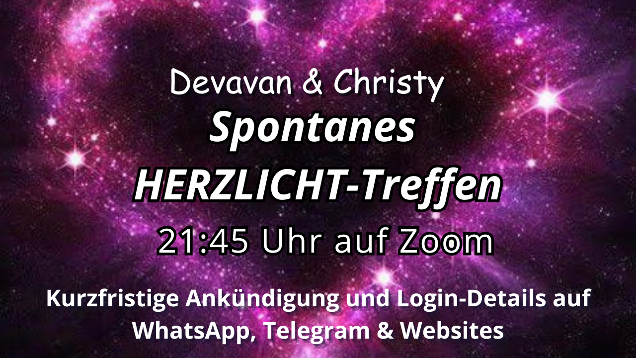 Die Ankündigung zu diesen spontanen ZOOM Treffen, die jeweils um 18:30 oder 19 Uhr stattfinden, werden auf den Telegram Kanälen “Devavan & Kurs in Wundern”https://t.me/devavan_kurs und “Devotion of Christ”https://t.me/Devotionofchrist kurze Zeit vorher angekündigt. Die Treffen finden voraussichtlich entweder (sowohl, als auch) Montags, Dienstags oder Mittwochs statt! ◊