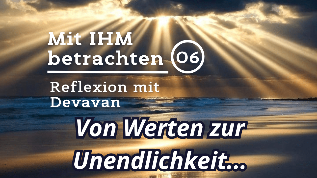 In dieser Episode 6 von “Mit IHM Betrachten” dieser neuen Serie 3 (als Weiterführung von “Kompromissloses Verbinden mit IHM” und “Mit IHM Beleuchten”) sehen wir uns genauer an, was uns CHRISTUS Jesus in Bezug auf unser Verständnis über Werte und zusammenhängenden Bedeutungen im transformativen Übergang in den SchöpferGEIST anbietet. Wir haben gelernt, dass hinter der Wahl, allen Dingen Bedeutungen von Wertvorstellungen zu verleihen, eine Größe des Geistes uns erwartet und uns einlädt, alle Ideen mit Begrenztheit dem Hl. GEIST zu übergeben, wenn wir die wesentlichen Details und Zusammenhänge sehen, die den einzigen Wert, den SchöpfungsGEDANKEN auszudehnen, offenlegen und uns in die Unendlichkeit wahrlich erkennen lassen. ◊ ◊