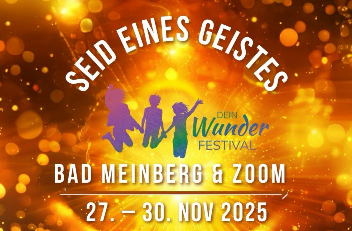 Wir freuen uns wieder auf die Zeit, uns in einem weiteren Wunder-Festival in Seinem GEIST zu verbinden und zu feiern. Titel: „Seid Eines Geistes“ — 27. – 30.Nov 2025 ◊