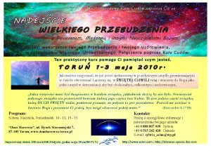 We are finally coming here with Devavan & Madonna in the “Dom Harcerza”, ul. Rynek Staromiejski 7, 87-100 Toruń, (www.domharcerza.torun.pl), in a Holy Instant, together, through the Power of conversion and in the utilization and extension of A Course in Miracles. We are joining in one mind, using the Mind of God, undergoing a spiritual Experience of Light in one’s own mind. Come as you are!