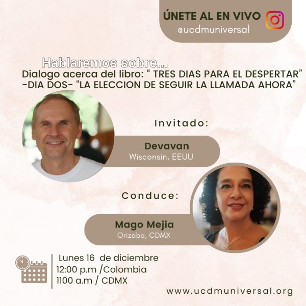 En esta entrevista via INSTAGRAM LIVE miramos al y conversamos del tema: “La elección de seguir la llamada ahora” que es el título de “Día 2” (Volumen II). Compartimos unas partes del libro “3 Dias para el Despertar – Día 2” de Devavan, que recientemente fue publicado. Las detalles se encuentra en la página web – https://devavan.com/eine-seite/libros/ . Se trata de reconocer la necesidad de pedir para la sanación de nuetra mente y rendirnos sin reserva a Dios. Es una elección en la transformación y es la decisión para recibir una revelación por la Gracia de Dios. Condujo de la entrevista: Mago Mejia